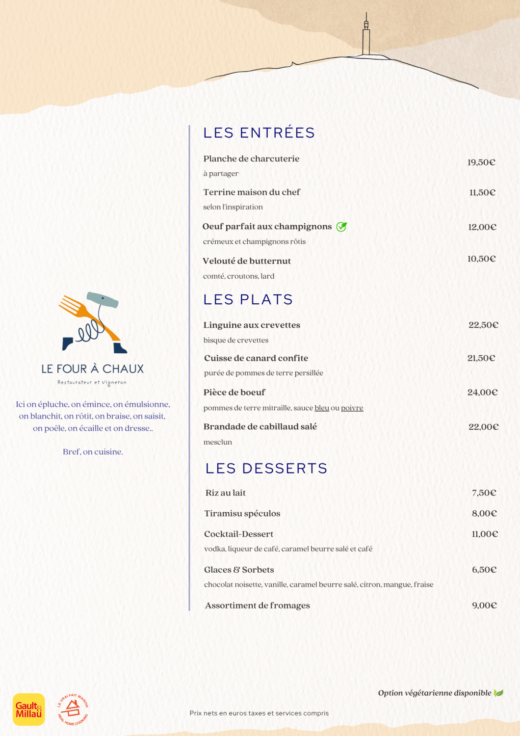 Au restaurant Le Four à Chaux, nous vous proposons une cuisine à la fois locale, moderne et méditerranéenne. Notre chef s'inspire de recettes d'ailleurs tout en privilégiant des produits d'ici, frais et de saison.